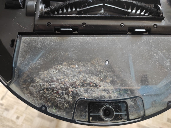 Cabelo, pó, restos de comida e outros detritos acumulam-se gradualmente na caixa de recolha de pó de grande capacidade do robô aspirador.